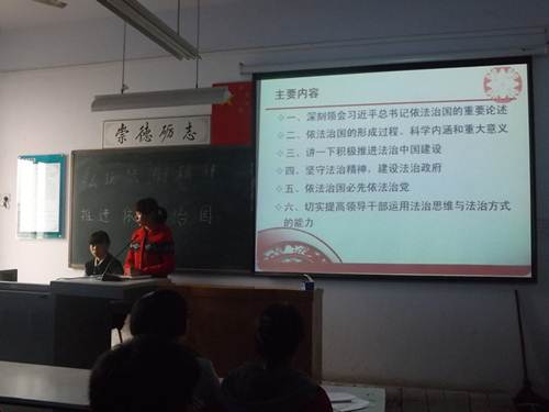 为引导公司员工深入学习中国共产党第十八届四中全会精神,深刻领会“全面推动依法治国”的重要意义。11月21日,法政学院积极组织14级全体同学于B4楼505、506、507、508、509教室开展了以“弘扬法治精神,推进依法治国”为主题的团学活动。
